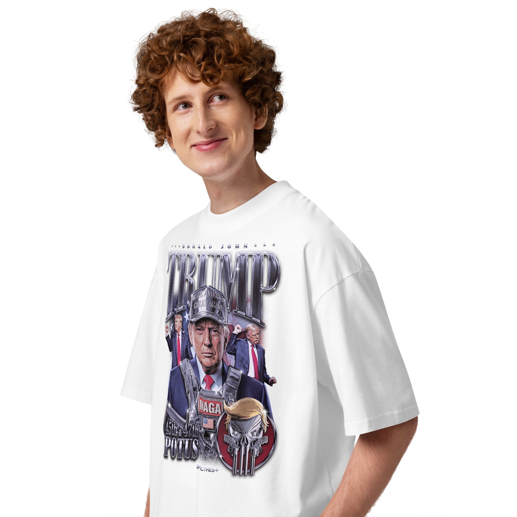 He’s on coins. He’s on collectibles. Now, he’s on your chest. An original Spectres-designed graphic of President Trump rocking his most iconic silver looks—straight from our best-selling collectible lineup.