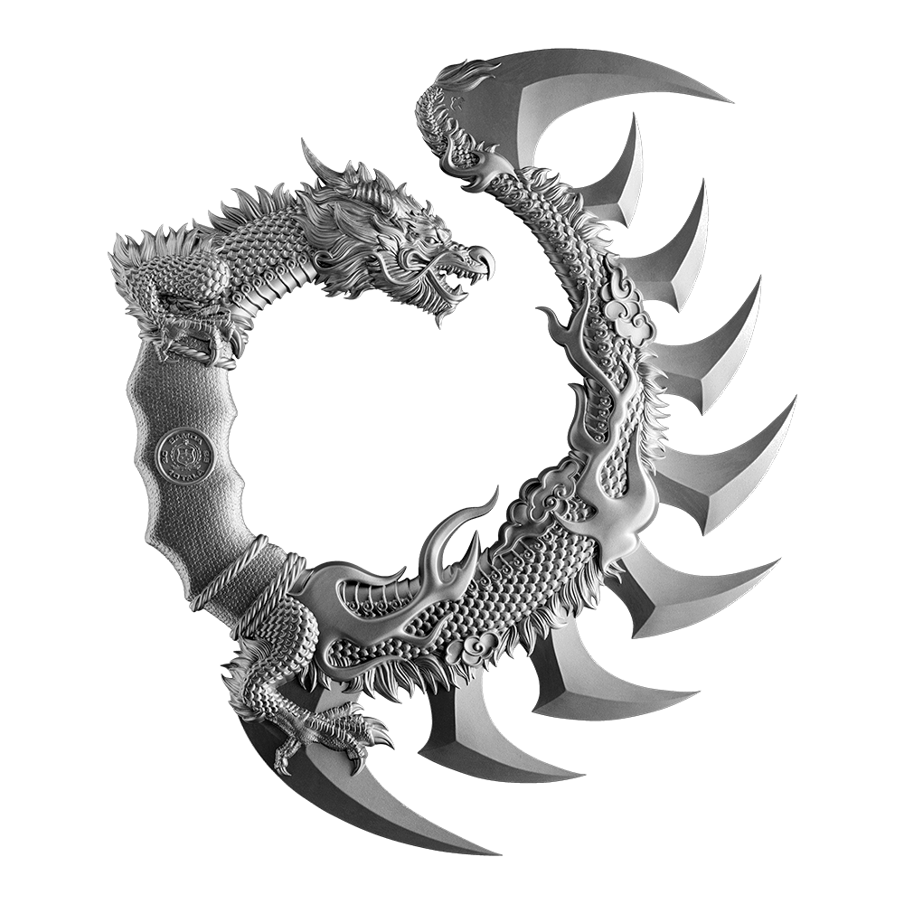 Nine curved blades emerge from the beast’s serpentine form, an intentional nod to the Dragon King’s nine sons, each believed to carry unique virtues and powers. From snout to tail, every inch is rendered in ultra high relief: detailed scales, horns, claws, and fins wrap around the dramatic crescent silhouette, flanked by sculpted clouds symbolizing Sheng Chi, also known as the dragon’s breath or “cosmic energy” in Feng Shui, which is said to attract wealth, luck, and protection. A circular medallion with the Chinese dragon symbol "龍" sits embedded in the handle, evoking the Flaming Pearl of wisdom and spiritual power often associated with dragon lore. While both sides of the coin share the same striking design, the obverse features the official coat of arms of Samoa, confirming its status as legal tender with a face value of 10 Tala.